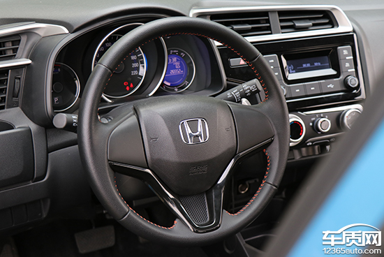 飞度的方向盘大小适中,虽然用料材质方面不佳,可是手感确实还不错。方向盘设计非常简单,没有任何实用多功能按键,方向盘也仅支持上下两向角度调节。潮跑/潮跑+版车型还带来了一点特色,方向盘内侧设计了橙色缝线,还搭配上亮黑色塑料的装饰件,中间采用网眼镂空设计。营造视觉上的运动感,集成多元素设计令新车的方向盘看起来不会太过朴素。