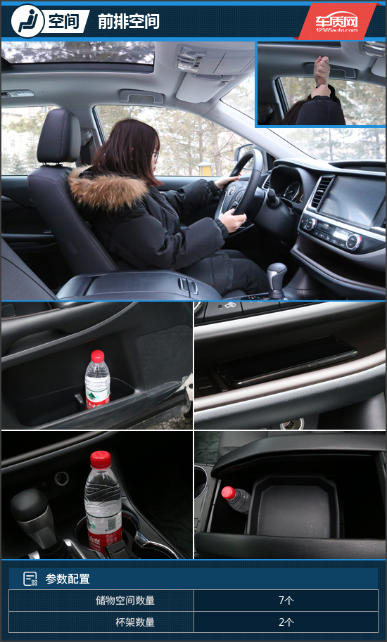 身高160cm的体验者坐进车内调整好前排座椅后,头部空间还有两拳以上的余量,这样的表现能够令人满意。前排储物空间非常丰富,前门板储物格设有独立杯槽,可容下大部分水杯。在挡把右方配有两个水杯架,内部配有限位器且深度非常值得肯定,足以对水杯起到有效固定。中控台下方贯穿式储物格非常便利,横向放置多部手机都没有问题。另外,中央扶手箱空间非常大足有24.5L,当放入下小编的照相机后还能装下小编的腰包以及多瓶矿泉水,这样的空间表现可想而知。