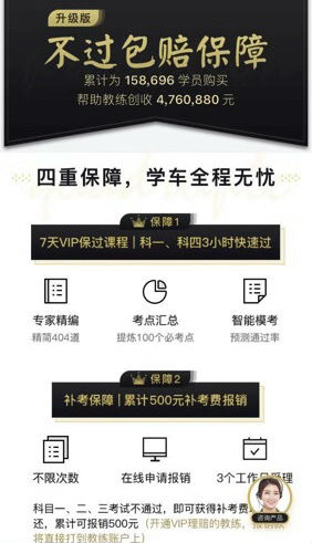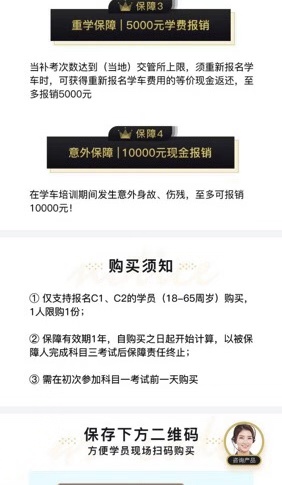 驾考保不但包含不过包赔+7天VIP课程的保障,而且还针对学习C1、C2驾照的不过的学员提供科一到三的最高500元的补考费用报销,五次不过重学最高5000元的费用报销,甚至还有最高10000元的学车意外保障(学车意外指身故或残疾),真正实现让学员减少拿证成本,提供通过保障,安心学车,轻松考照的服务愿景,并以价格稳定、赔付快且稳定的保障彻底免除学员的后顾之优。