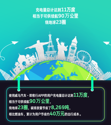 “五一”期间,威马汽车·即客行的用户足迹已遍布全国,充电总量达到11万度,可供续航里程达903,767公里,相当于绕地球23圈,碳排放量节省了8,269吨,相比燃油车累计为用户节省约40万元的出行成本。