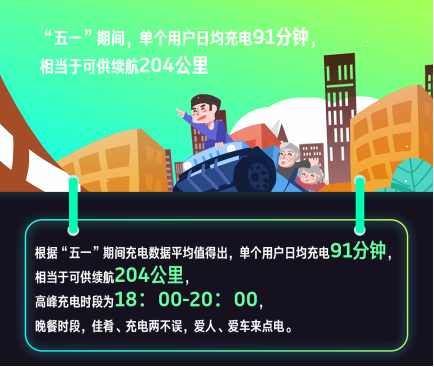 根据“五一”期间充电数据平均值显示:单个用户日均充电91分钟,相当于可供续航204公里,实时消除用户对于续航里程的焦虑,随时随享,全面兼容。