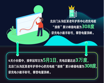 在4天小长假中,5月1日为接单冠军日,充电量达29,980度,北京门头沟区某老年护养中心的充电桩“接客”峰值电量为308度,获充电小能手称号,荣登充电量排行榜榜首。