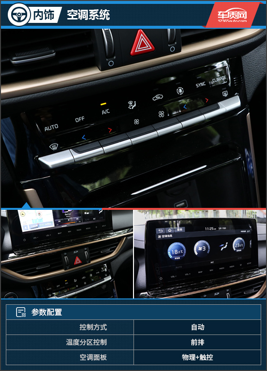 空调采用了物理+触控方式,其中,物理按键排布清晰,按下后的质感也令人满意。本次试驾车前排采用双温区设置,并配有自动空调,给个好评。同时,你也可以通过中控屏对温度以及风量进行调节,不过还是推荐采用物理按键,非常便捷。此外,该车还配备了绿净系统,可过滤掉PM2.5等有害气体。