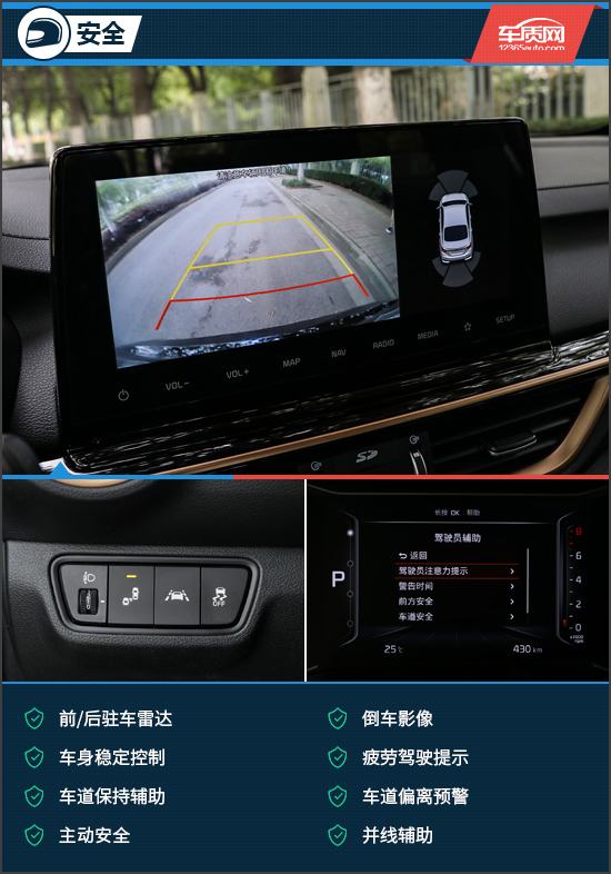 安全方面可谓面面俱到,试驾车配备了车道保持辅助、车道偏离预警、并线辅助、疲劳驾驶提示、主动安全、车身稳定控制以及前/后驻车雷达等,由于时间关系,我们仅对倒车影像进行了测试。经过实测,该倒车影像清晰度有待加强。此外,当离障碍物距离过近时,右侧的模拟系统也会给予警告提示。