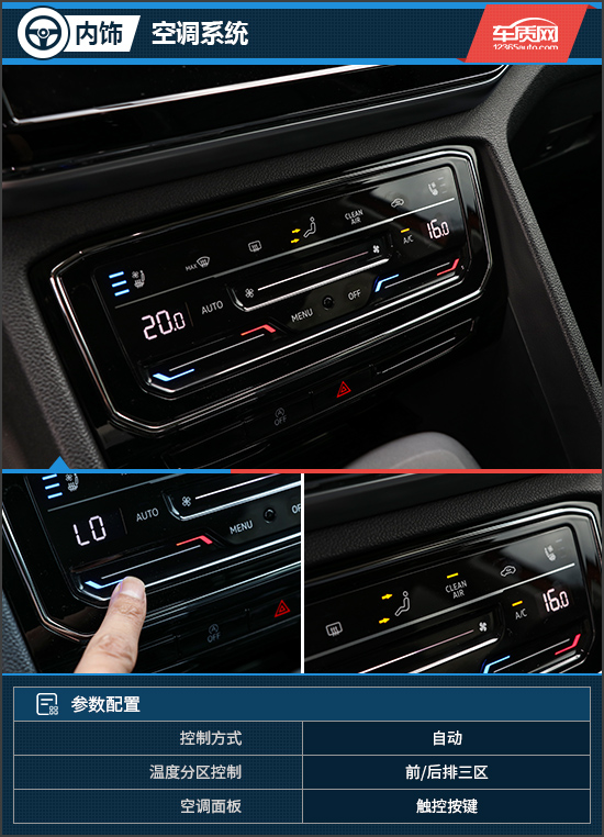 空调面板设计是途昂与途昂X内饰部分最大的差异之一,前者采用了传统按键+旋钮的组合形式,而后者则为全触控式设计,风量和温度调节只需手指横向滑动即可完成,科技感出众。同时,全系标配CLEAN AIR空气净化系统,能够为车内人员带来更为清洁的空气。