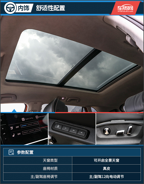 途昂X配备了尺寸可观的可开启全景天窗,能够大幅提升后排乘客的开扬感。车顶采用了Chamude超细纤维皮包裹,翻毛皮材质手感细腻,配合带有三组记忆功能12向电动调节的维也纳真皮座椅,无论是质感还是舒适性,都有着堪比豪华品牌车型的表现。