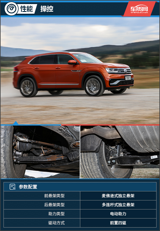 操控性方面,途昂X偏大的车身尺寸和较高的重心都是明显“硬伤”,但当快速通过弯道时的侧倾幅度却不大,可见悬架行程后半段调校偏硬,整体操控风格很有“大众味”,也符合其轿跑SUV定位。