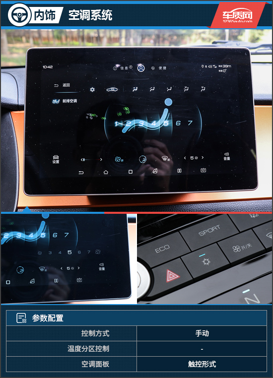 空调采用触控操作,同时还配有几个实体物理按键位于旋钮换挡前方。进入空调界面后,空调操作方式非常简单,最左侧为温度控制,右侧为风量控制,而最上方为空调风向。此外,即便是这台顶配试驾车也仅配备手动空调。
