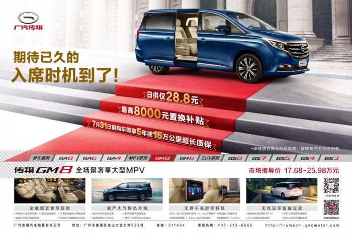 全场景奢享大型MPV传祺 GM8,是广汽传祺历经多年精心打磨的力作。其凭借 “威严大气恢弘外观、全维感官奢享座舱、无微不至舒享科技、无忧安享智能安全”四大核心价值,颠覆传统商务,专为新一代商务精英量身定制,连续数月蝉联中国品牌高端MPV销量冠军。现购买传祺GM8,即可享受:日供28.8元,尊享豪华级MPV,最高享8000元置换补贴,以及5年或15万公里超长整车质保优惠政策。