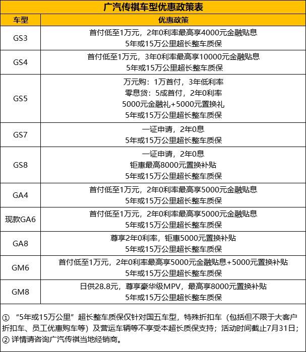 全能宽享MPV传祺GM6尊崇纵享生活N次方,用热情拥抱生活。自今年初上市以来,凭借“锐动大气外观、越级宽享空间、祺云AI智慧互联、舒适安全畅行”等出众的全能实力倍受消费者追捧,位于MPV 销量榜前列。现购买传祺GM6,即可享受:首付低至1万元,2年0利率最高享5000元金融贴息+5000元置换补贴,以及5年或15万公里超长整车质保优惠政策。
