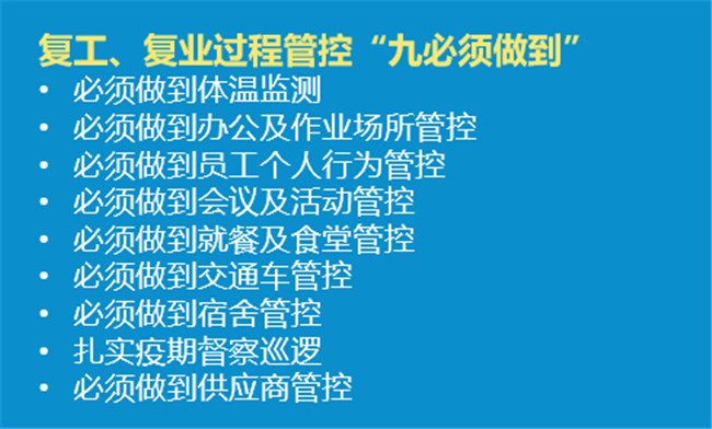 所有人员返工当天自备口罩,必须佩戴口罩进入厂区或办公区域,全员、全程、全天均需佩戴口罩。