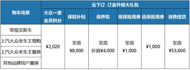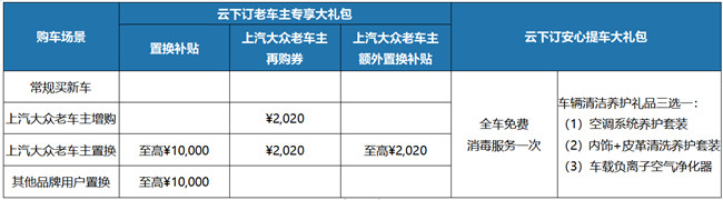 礼包详情见下方表格(各款车型所涉具体优惠内容有所差别,详情可咨询上汽大众当地经销商):