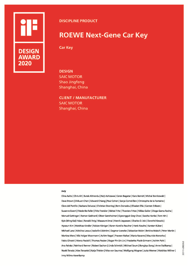 德国iF设计大奖创立于1953年,由德国历史最悠久的工业设计机构——汉诺威工业设计论坛(iF Industrie Forum Design)每年定期举办。该奖以“独立、严谨、可靠”的评奖理念闻名于世,含金量极高,享有“全球工业设计四大满贯”之一的盛誉。此次,上汽荣威创意遥控钥匙设计作品(量产)“宁静旋风”受到78位国际评委的一致青睐,不仅展现了荣威品牌在广义产品设计领域的精益求精,同时,也充分证明了其具备世界级设计能力。