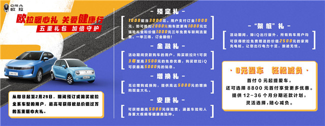 即日起至2月29日,如果你购买的车型是欧拉R1-301km,那么恭喜你,不仅可以以1999元订金获得一口价提车的资格,最高抵扣9999元购车款,还可享受终身免费保养,或3年5折换购服务!