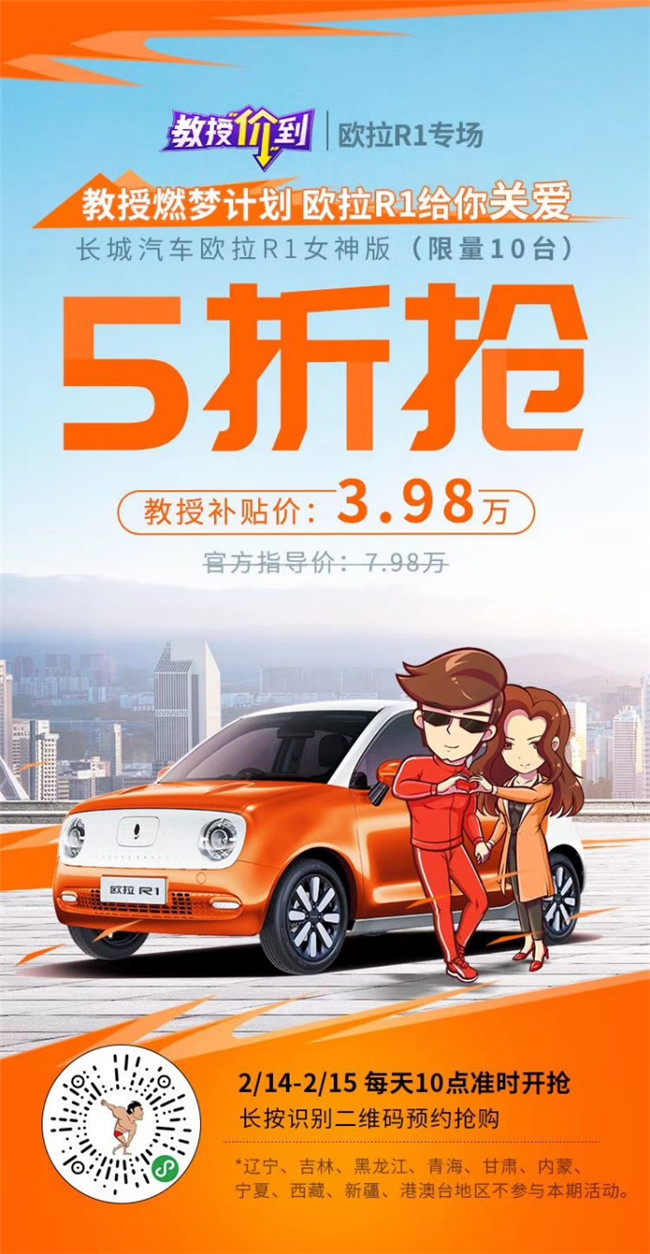 特殊时期对家人的关爱更是不能忽视,一份充满爱意的礼物胜过千言万语。欧拉联合“玩车教授”送上出行神器!2月13日、14日当天,用户可通过微信小程序“玩车教授”参与5折抢购欧拉R1 351km女神版活动,以半价将关爱送给你爱的家人。