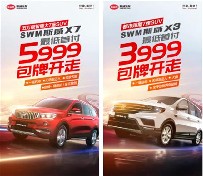 选购斯威X7手动挡/自动挡或是斯威X3国五全系,消费者除可选最高24期分期贷款,下单X7手动挡、自动挡,还将分别享受最高5500元和最高6500元的贴息政策,斯威X3同样可享最高4300元贴息支持。
