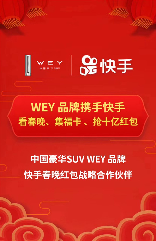 在春节期间,为贴近用户的内心诉求,提升幸福感和关怀力度,WEY品牌除了与快手展开强强合作外,还与携程、汽车之家合作推出了以“中国年,中国WEY”为主题的活动,实现品牌营销多元化和聚焦化。佳节礼遇精彩纷呈,让消费者在春节乐享中国WEY,礼赞中国年。
