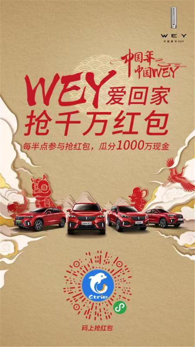 乐中国年,享中国WEY——WEY爱回家。WEY与携程联合推出了WEY爱回家活动,打通春节高铁、飞机购票、春节旅游等春运线上抢票订票环节,通过品牌助力抢票以及进店赢大奖等互动游戏,为消费者顺利回家提供助力。