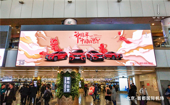 乐中国年,享中国WEY——WEY爱出行。在春节期间,WEY品牌在深圳、北京、成都、重庆、广州、西安、杭州、三亚、济南、太原、福州、厦门、南昌等多城机场实现“WEY你送福”大屏广告投放,持续引发消费者情感共鸣。