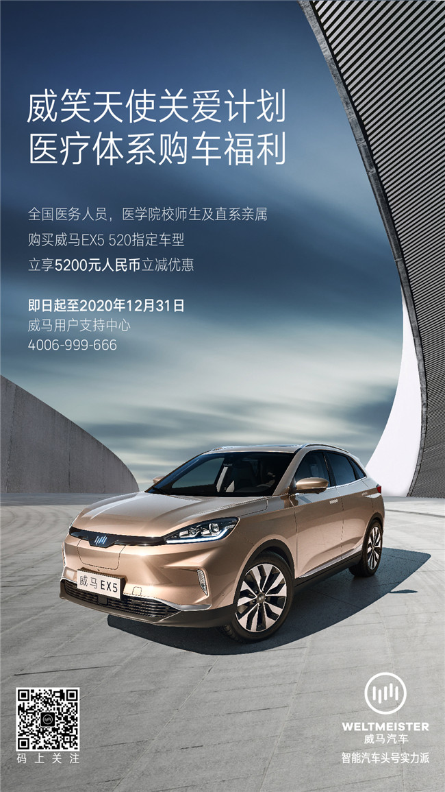 即日起至2020年年末,全国医务人员购买威马EX5 520指定车型,均可享受5,200元人民币的立减优惠