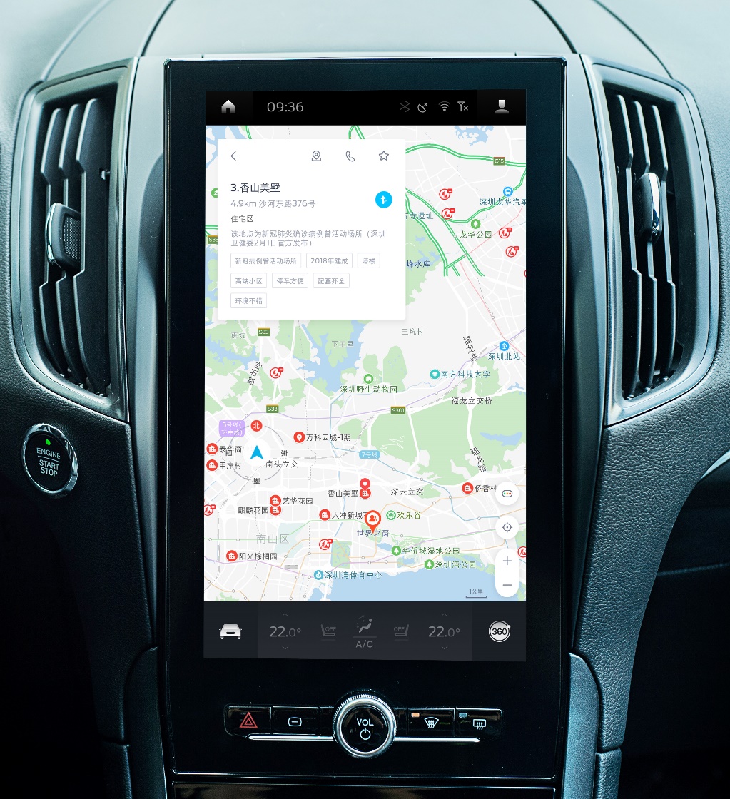 目前,借助百度智能导航的技术优势,长安福特搭载SYNC+智行信息娱乐系统的车型均已获得功能更新:用户在使用车载智慧导航时,可获取实时整合的疫情信息,规划更加安全便捷的行车线路,让每一次出行都“绕开”敏感区域病毒,做到心中有数。