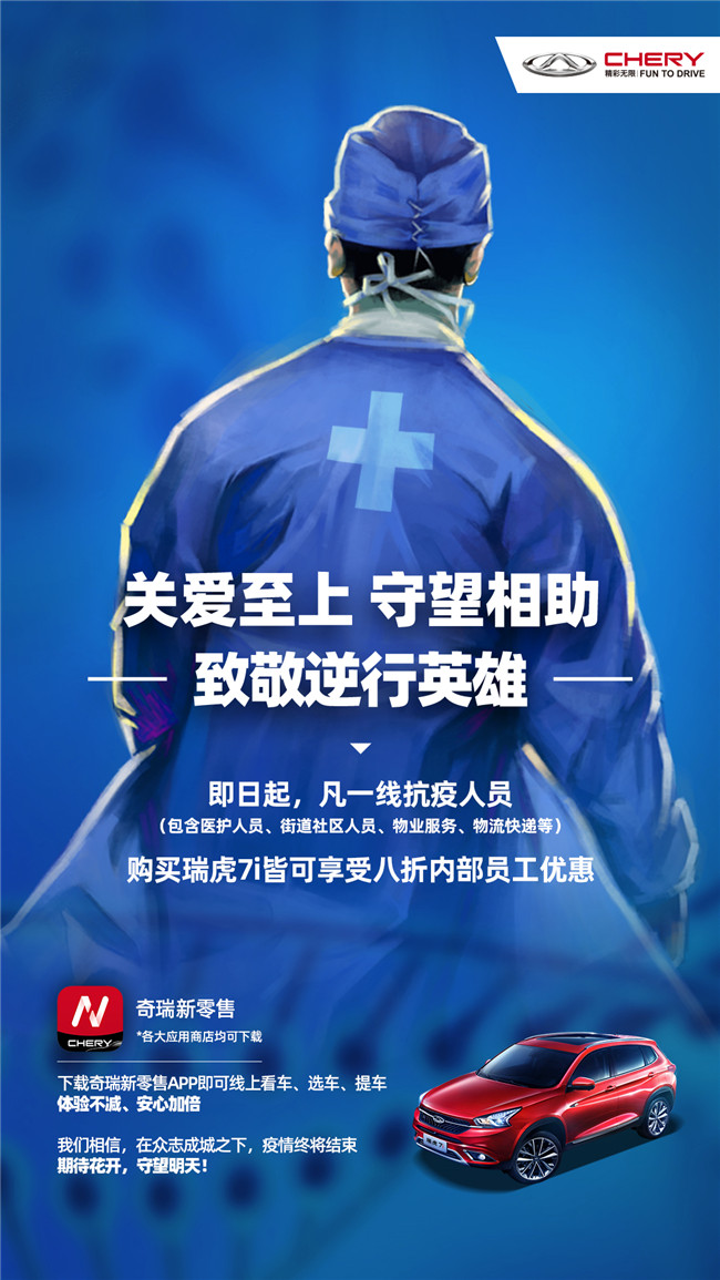 疫情无情人有情。在这场没有硝烟的战场上,各行各业都在用自己的方式坚守,并竭尽所能贡献自己的力量,而医护人员、街道社区人员、物业服务人员、物流快递人员等作为战疫的主力,值得全社会尊重和支持。此次奇瑞新零售推出特别优惠政策,向所有奋战在一线的逆行英雄致敬,充分体现了奇瑞汽车“以人为本”的企业价值观理念。