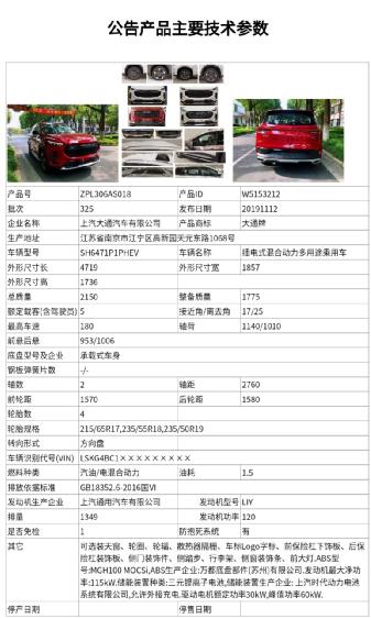 【上汽MAXUS全新插电混合动力SUV EUNIQ 6 PLUG IN公示信息】