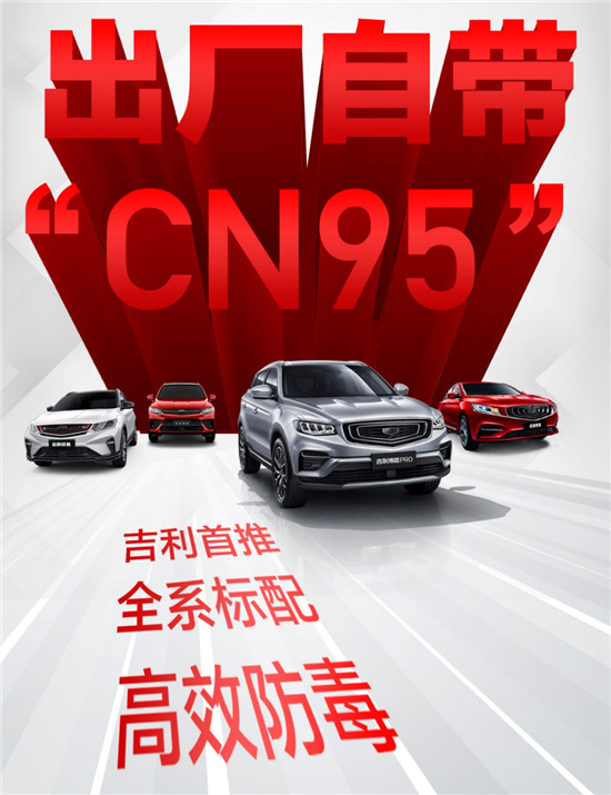 继为全国新老车主免费更换车规级CN95高效复合空调滤芯(以下简称“车规级CN95空滤”)后,吉利汽车3月6日又宣布,即日起旗下所有在售车型出厂时都将配备车规级CN95空滤,让用户提车即可享受到N95口罩级的出行安全防护,护航每一次健康出行。