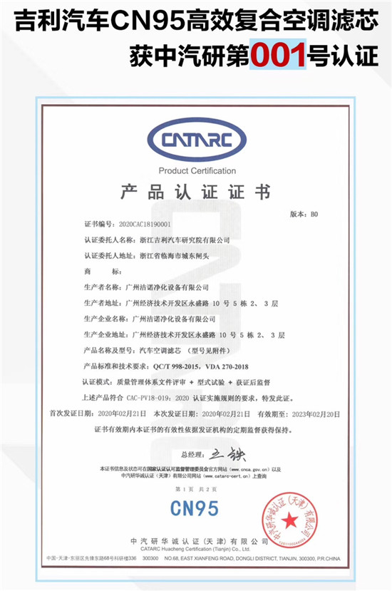 值得一提的是,吉利研发的车规级CN95空滤已于2月21日通过了中国汽车技术研究中心检测,成为第001号获得官方最高等级认证的CN95级别的高效复合空调滤芯。