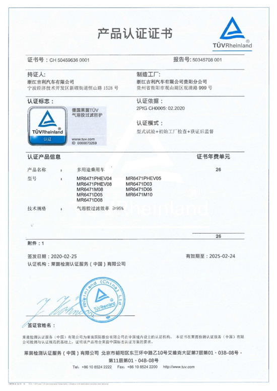 与此同时,吉利汽车还获得了由全球知名认证机构“德国莱茵TÜV集团”颁发的全球首张001号整车级固体颗粒物/气溶胶过滤防护China-mark(中国标识)认证。吉利、领克与几何品牌均获得了莱茵TÜV集团整车级《气溶胶过滤防护》认证,代表着吉利整车集成的空气净化系统达到了行业领先水平。