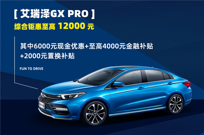 从3月1日起,购艾瑞泽GX 冠军版、艾瑞泽GX PRO、艾瑞泽5 PRO在内的奇瑞全系车型,可享受高额优惠。艾瑞泽GX PRO综合钜惠12000元,其中6000元现金优惠+至高4000元金融补贴+2000元置换补贴。