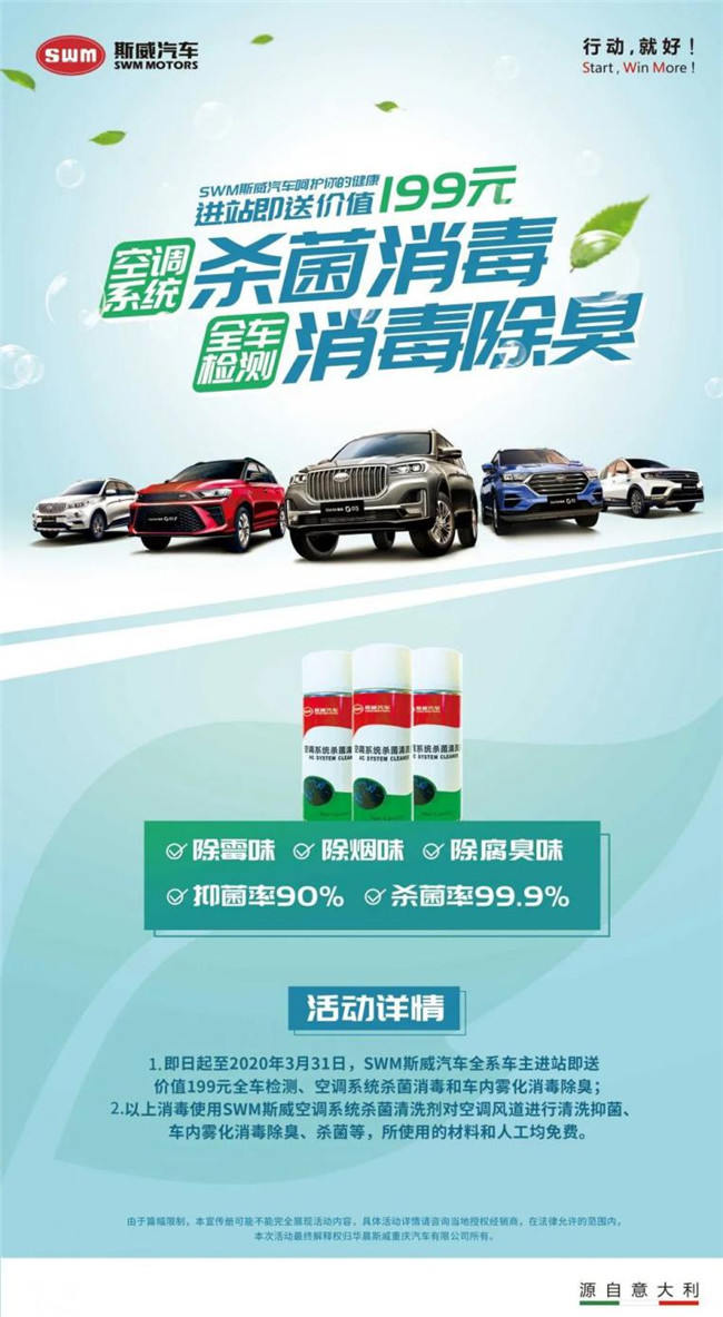 全国疫情逐渐消退,公共场合人群渐多,外出切记做好个人防护;自驾出行,口罩、消毒液、酒精等健康装备更要配齐。全民复工大潮来袭,SWM斯威汽车现面向全国斯威车主,壕送“全车及空调免费深度杀菌消毒”复工安全礼,体贴呵护全民健康安全出行。