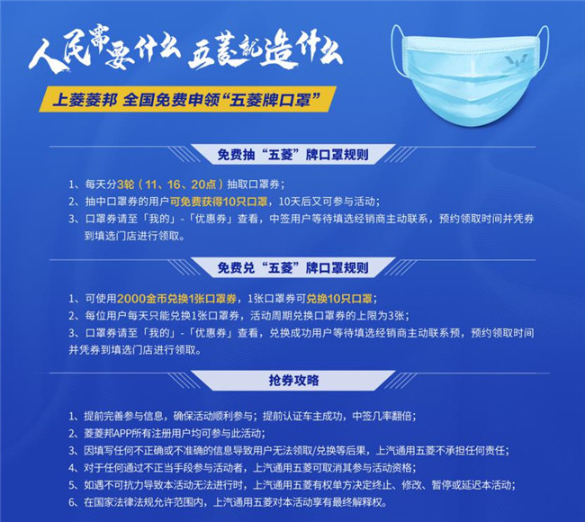 此次活动,全国人民都可以在上汽通用五菱官方APP“菱菱邦”参加,共分为免费抽取、“金币”兑换两种参与形式。其中,免费抽取部分,全国每天将有10000名用户能够免费抽中五菱牌口罩,每人10只,共计每天10万只;“金币”兑换部分,只要在“菱菱邦”APP拥有一定数量的虚拟金币,就可免费兑换对应的口罩。