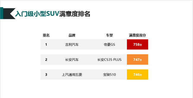 | 入门级小型SUV | 帝豪GS | 吉利汽车 | 758 |