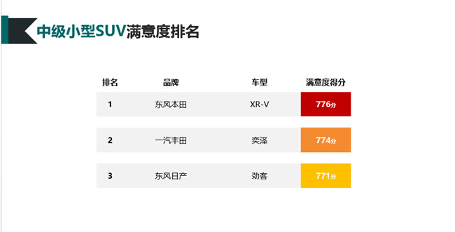 | 中级小型SUV | 本田XR-V | 东风本田 | 776 |