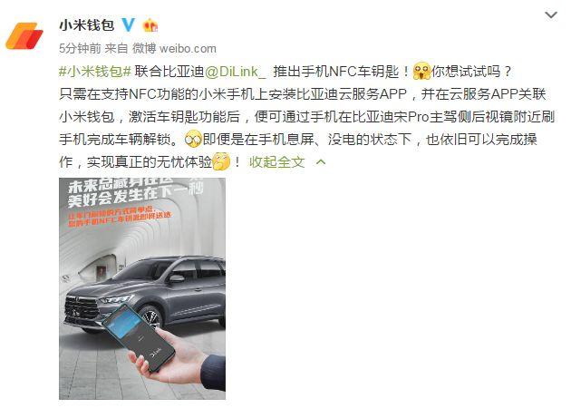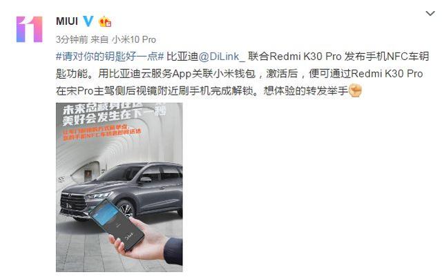 3月24日,小米旗下的Redmi真旗舰手机"Redmi K30 Pro"正式发布。此次发布的新机型除众多亮眼新功能外,最值得一提的便是比亚迪DiLink与Redmi K30 Pro联手发布的黑科技——手机NFC车钥匙;该功能的发布意味着用户可使用Redmi K30 Pro轻松解锁比亚迪汽车,从此告别传统车钥匙带来的众多烦恼。