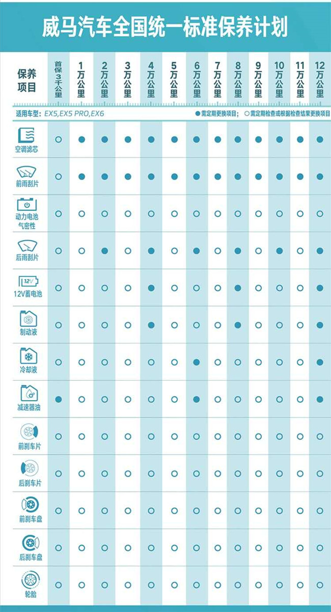 官方发布的计划中全面公示了包含空调滤芯、前后雨刮片、制动液在内的共计13项定期保养项目,且所有保养项目均明确标注工时价和配件价,以专业化、透明化、规范化的售后服务体系,为用户无忧出行保驾护航。此外,可视化查询服务也已同步上线,车主只需在手机上关注“威马粉丝联盟”微信公众号,在“享服务”菜单栏中点击“保养计划及价格”即可1秒速览全套保养项目、保养公里数和保养价格。