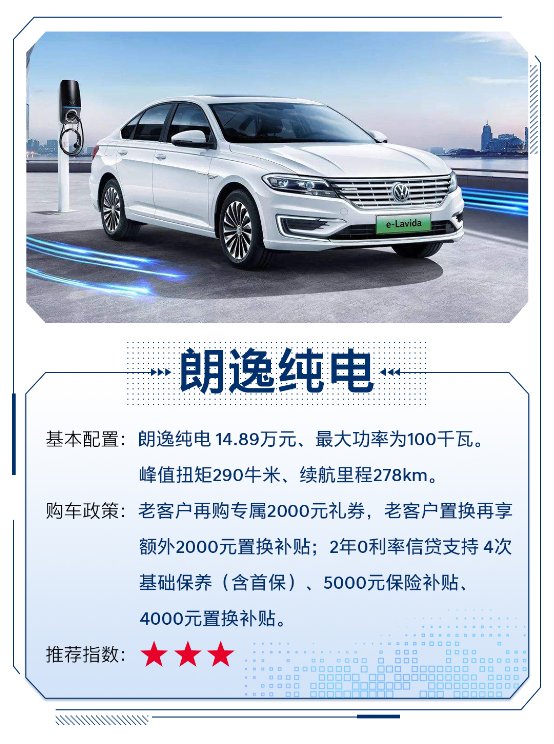 推荐理由:该车是基于燃油版朗逸打造,技术成熟可靠,续航里程是短板,适宜信仰大众族用户。