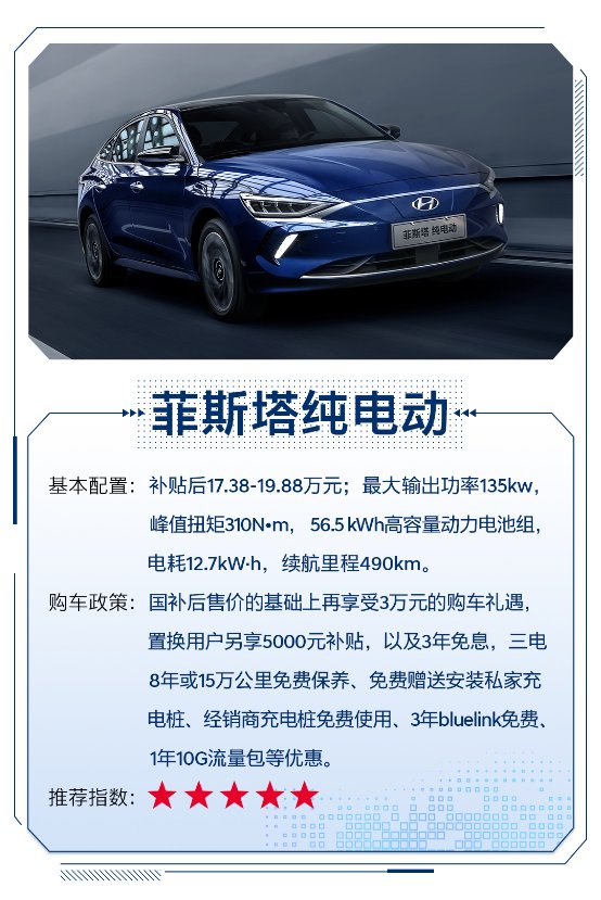 推荐理由:该车定位“纯电时尚魅力座驾”,也是北京现代首款纯电轿车,该车以现代汽车全球品质和技术为背书打造,有望成为合资纯电A级轿车标杆车型。