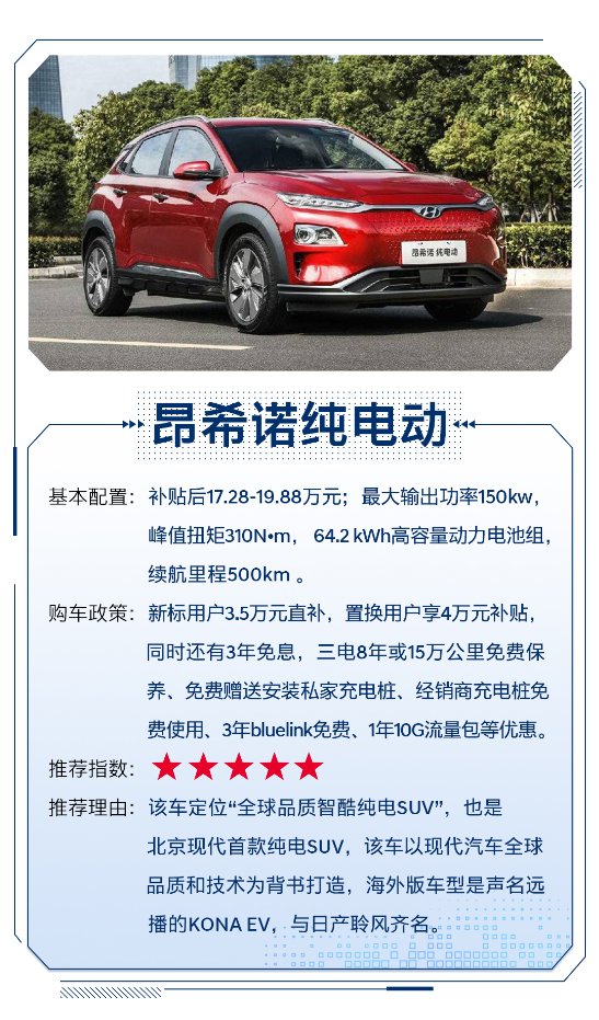推荐理由:该车定位“全球品质智酷纯电SUV”,也是北京现代首款纯电SUV,该车以现代汽车全球品质和技术为背书打造,海外版车型是声名远播的KONA EV,与日产聆风齐名。