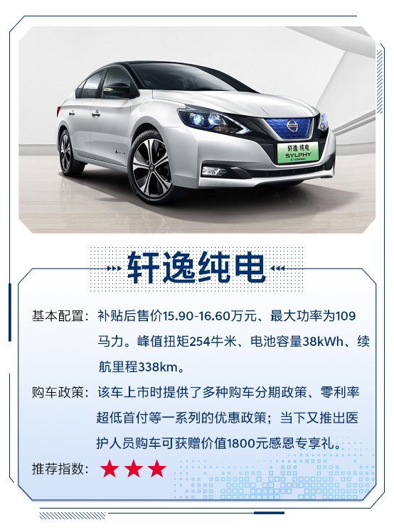 推荐理由:轩逸纯电是日产采用世界知名车型聆风的先进技术与国内热销车型结合而成,续航里程平平。
