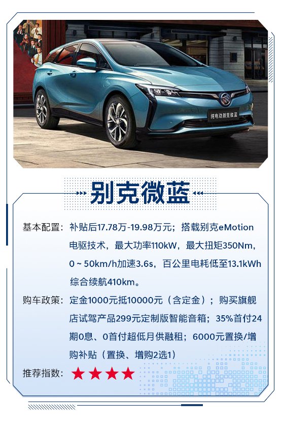 推荐理由:该车是基于别克全新电动车架构正向开发的产品,造型上介于MPV和旅行车之间,设计较为新颖,续航水准中规中矩。
