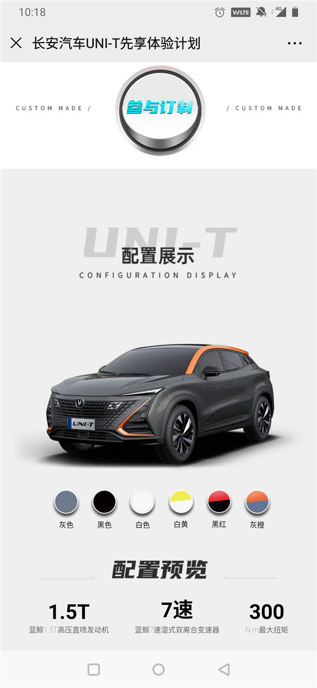 这次UNI-T先享体验计划,全球仅有520个名额,成功入选后,先享体验者将在5月15日起陆续提车,抢先享受UNI-T带来的未来智慧汽车出行体验,并能获得8000元“改装基金”,厂家一对一进行专属座驾定制。厂家提供了撞色车身、格栅灯、尾喉、内饰颜色、中控装饰件风格、精品附件、专属标识等多项定制化方案,先享体验者可以将自己的创意和个性融入到车辆之中,造就一台真正专属于自己并充满魅力的UNI-T座驾。
