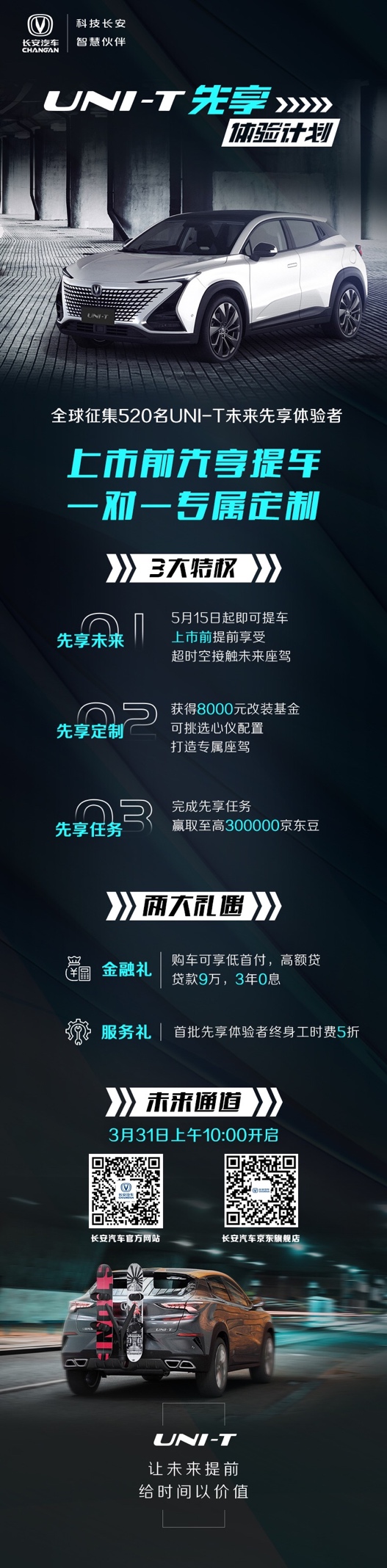 3月31日,长安汽车宣布于上午10:00启动UNI-T先享体验计划,全球公开征集520名UNI-T未来先享体验者。先享体验者可在UNI-T上市前完成提车,并且能够自由选择心仪配置,由厂家打造一对一的专属定制座驾。用户只需登录长安汽车官网或长安汽车京东旗舰店,参与该活动,即有机会成为先享体验者。