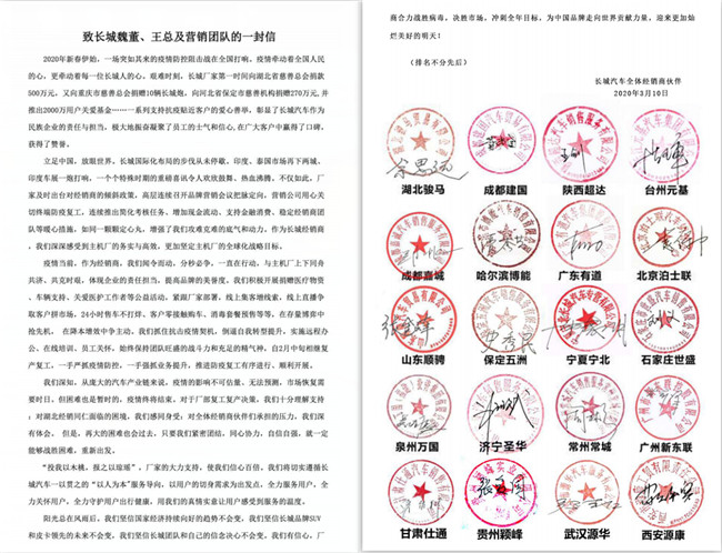 3月10日,长城汽车收到124家经销商伙伴联名书写的《致长城魏董、王总及营销团队的一封信》,信中经销商伙伴对长城汽车在疫情期间的大力支持表示感谢,这封至真至诚的感谢信,提振了长城汽车集体信心的同时,也给处在“寒冬”的车市带来温暖。