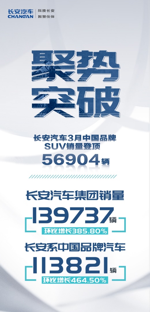 同时,“互联社交SUV”——长安CS35PLUS也表现抢眼,凭借10780辆的优异表现,助推长安CS35以销售10891辆、环比增长467.8%的成绩加冕小型SUV细分市场冠军!为3月长安汽车夺得中国品牌SUV市场销量冠军做出积极贡献。