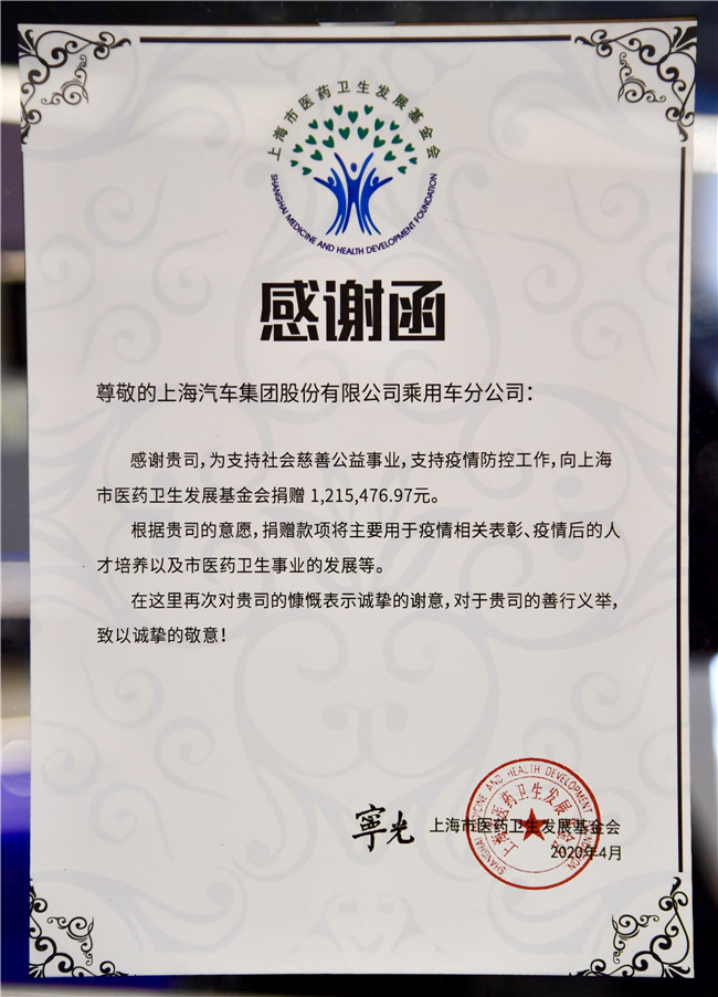 作为上海市医药卫生行业唯一的基金会,上海市医药卫生发展基金会在疫情爆发后一直支持上海援鄂医疗队。基于此,上汽乘用车党委和工会将1,215,476.97元善款捐赠给上海市医药卫生发展基金会,为援鄂英雄送去关爱。另外,上汽乘用车还将为返沪援鄂医疗队提供出行援助,安排车辆接送战疫英雄从隔离点前往医院检查,并护送他们平安回家。