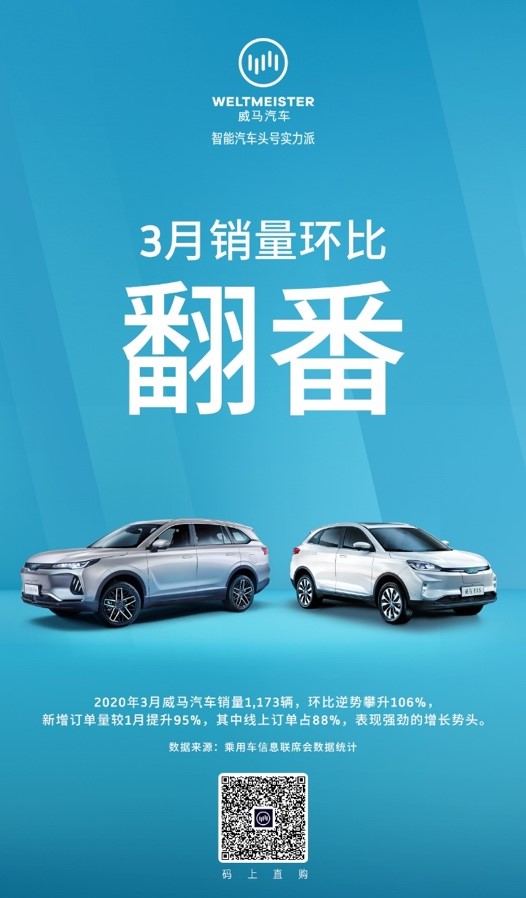 新势力车企逐步成为市场重要参与力量,在国内纯电动汽车中的份额从19年的9%逐步增长至今年2月的16%。其中,威马、蔚来、小鹏等造车新势力的第一梯队,在这场“免疫力”的集体淘汰赛中,表现亮眼,率先实现突围。3月,威马和蔚来双双月销破千,取得环比翻番的优异成绩,小鹏虽然只公布了一季度总销量,但在疫情带来的不利背景下,也依然跑赢大盘。