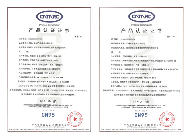 近期,根据《CATARC标志认证实施规则-汽车空调滤清器过滤等级》(以下简称“CN95认证”)规则,WEY品牌旗下车型空调滤芯获得国内权威第三方认证机构——中国汽车技术研究中心华诚认证中心颁发的最高等级“CATARC CN95”认证证书,并承诺超30万车主均可免费更换(活动日期:4月20日-6月30日),快速响应用户需求,走在汽车生态健康领域的行业前沿。