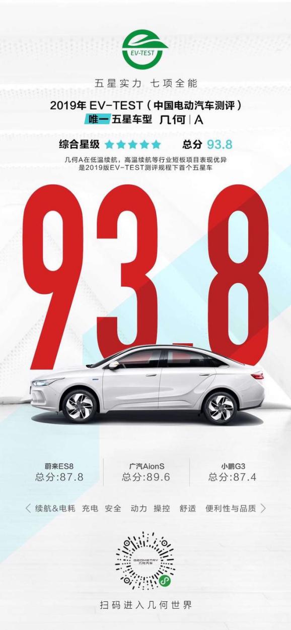 在实际路况的专业评测中,也进一步证实了几何A的真实续航确实要更加优秀。中国汽车技术研究中心发布的2019年EV-TEST第二批测评结果公布,几何A是唯一一款获评5星的车型。其中,在与真实续航息息相关的“续航和电耗”这一项上,几何A更是以97.5分的成绩,秒杀Aion S的84.1分,足见几何A在“真续航”上的真实力。